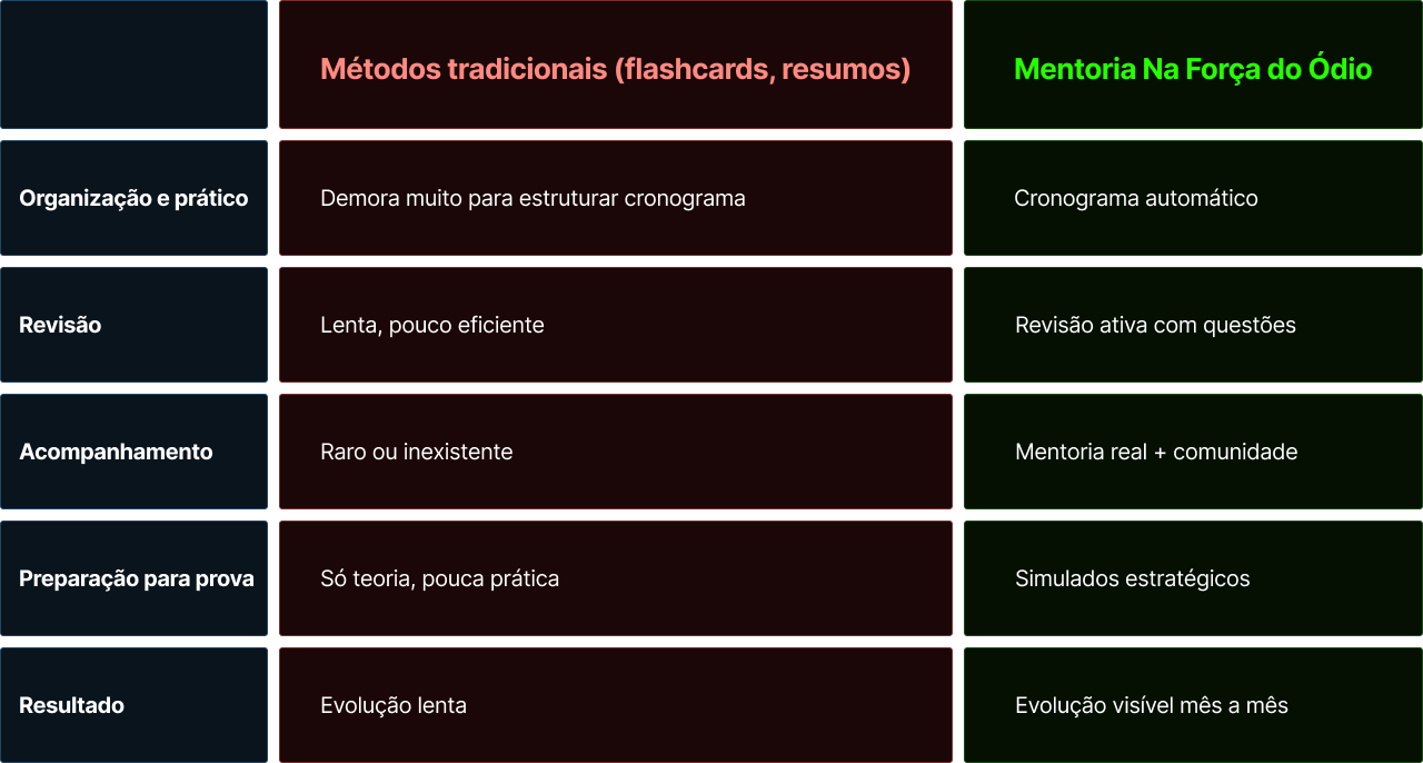 Pare de se perder em resumos, flashcards e técnicas mirabolantes. Aqui você aprende o básico bem feito: estudo ativo com questões, simulados estratégicos e acompanhamento de verdade até a sua aprovação.
