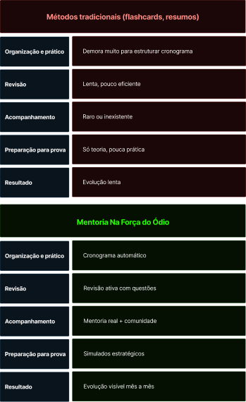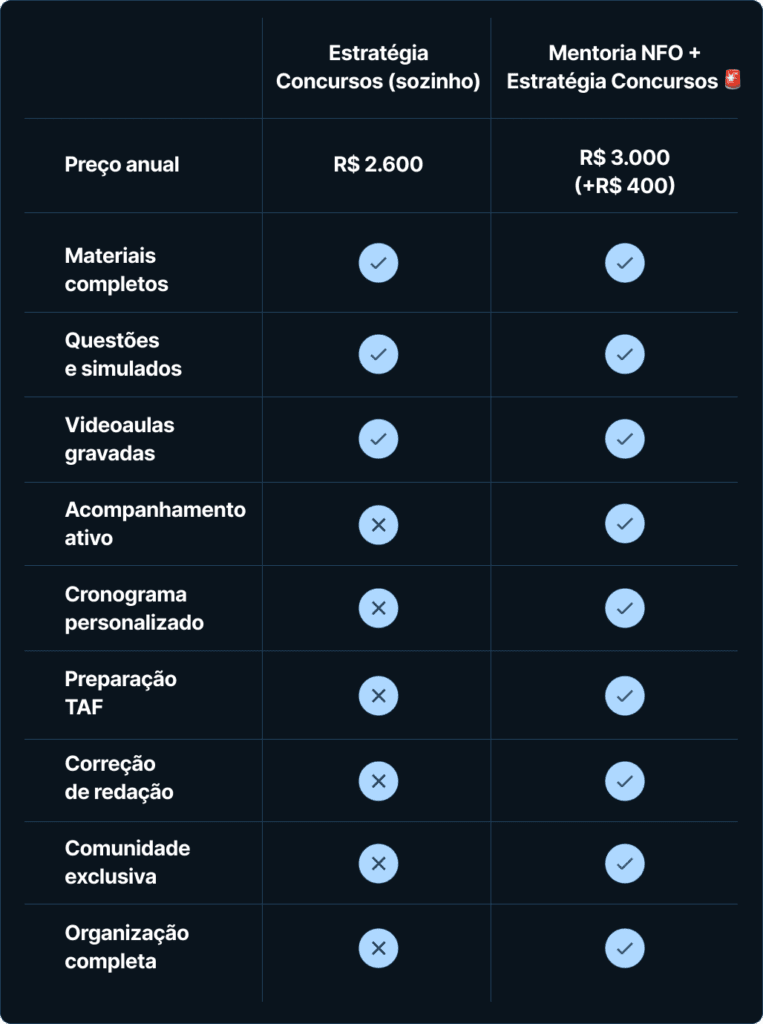 Além de todo o sistema completo da Mentoria Na Força do Ódio (cronogramas personalizados, questões estratégicas, simulados, acompanhamento em TAF, redação e organização de estudos), você terá acesso total à plataforma Estratégia Concursos.